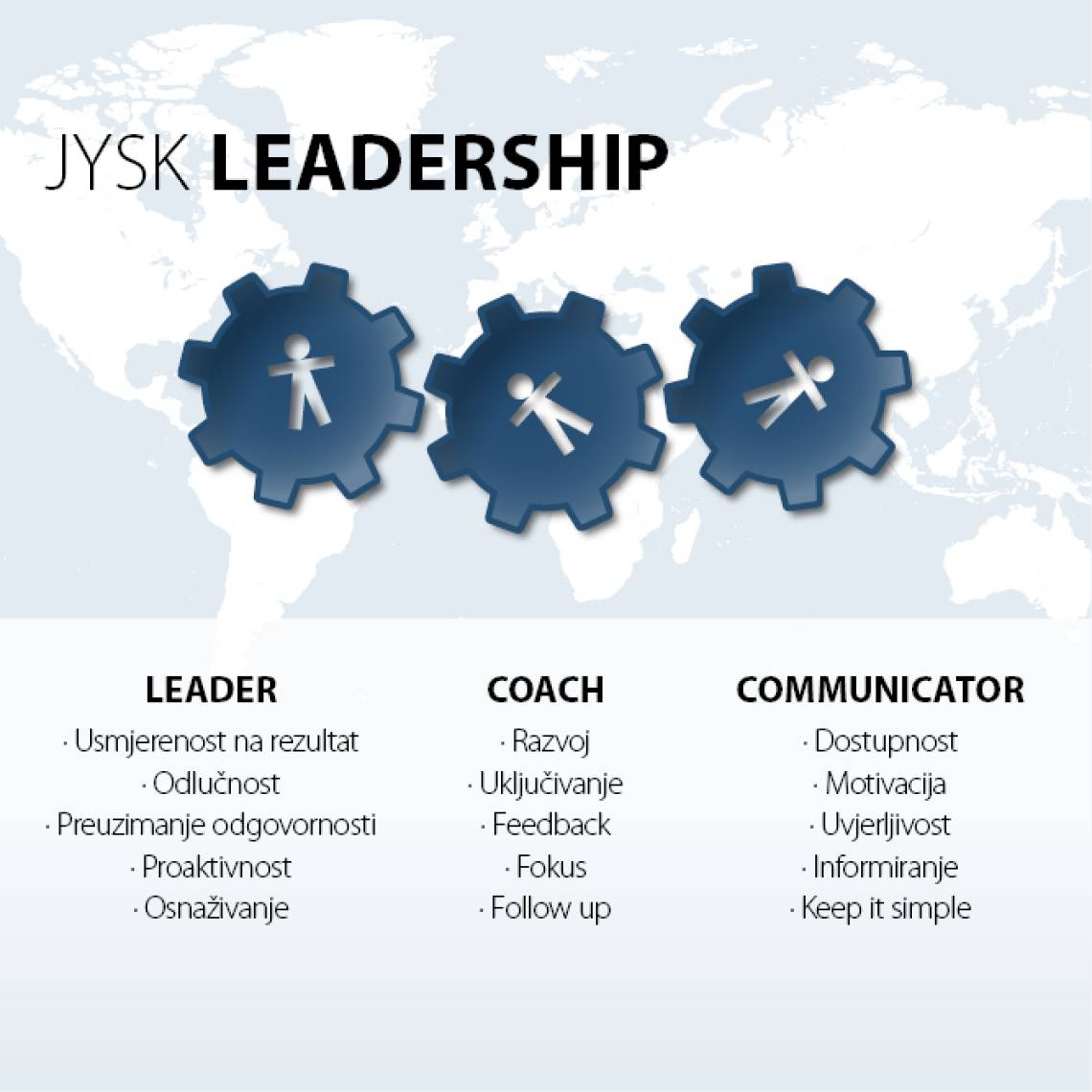 Pored naših temeljnih vrijednosti, od svojih voditelja očekujemo da primjenjuju JYSK Leadership koji obilježavaju sljedeće značajke: Leader, Coach i Communicator.