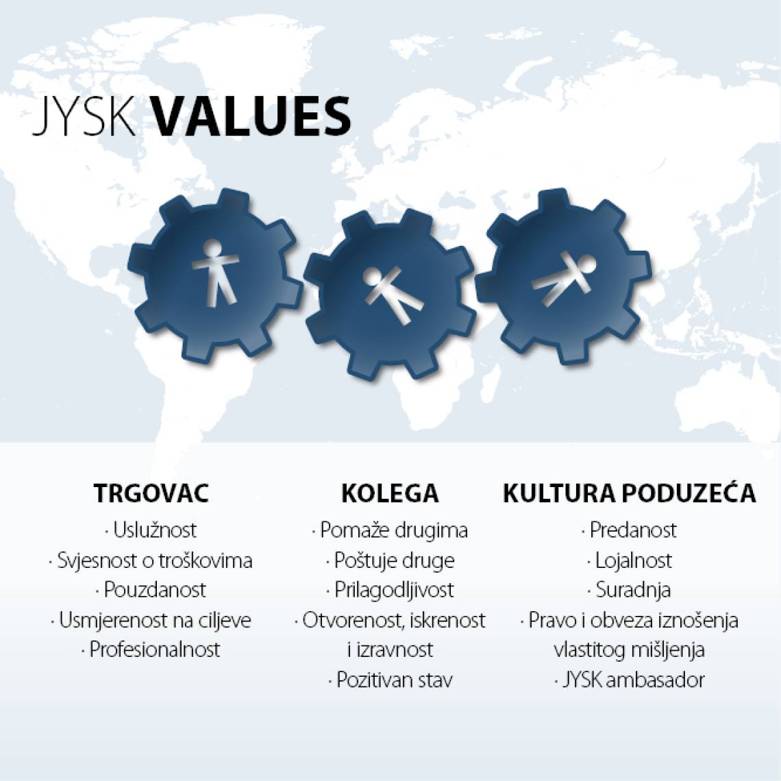 U JYSKu njegujemo međusobno povjerenje i samostalnost te smatramo da uz veliku slobodu u radu dolazi i velika osobna odgovornost.